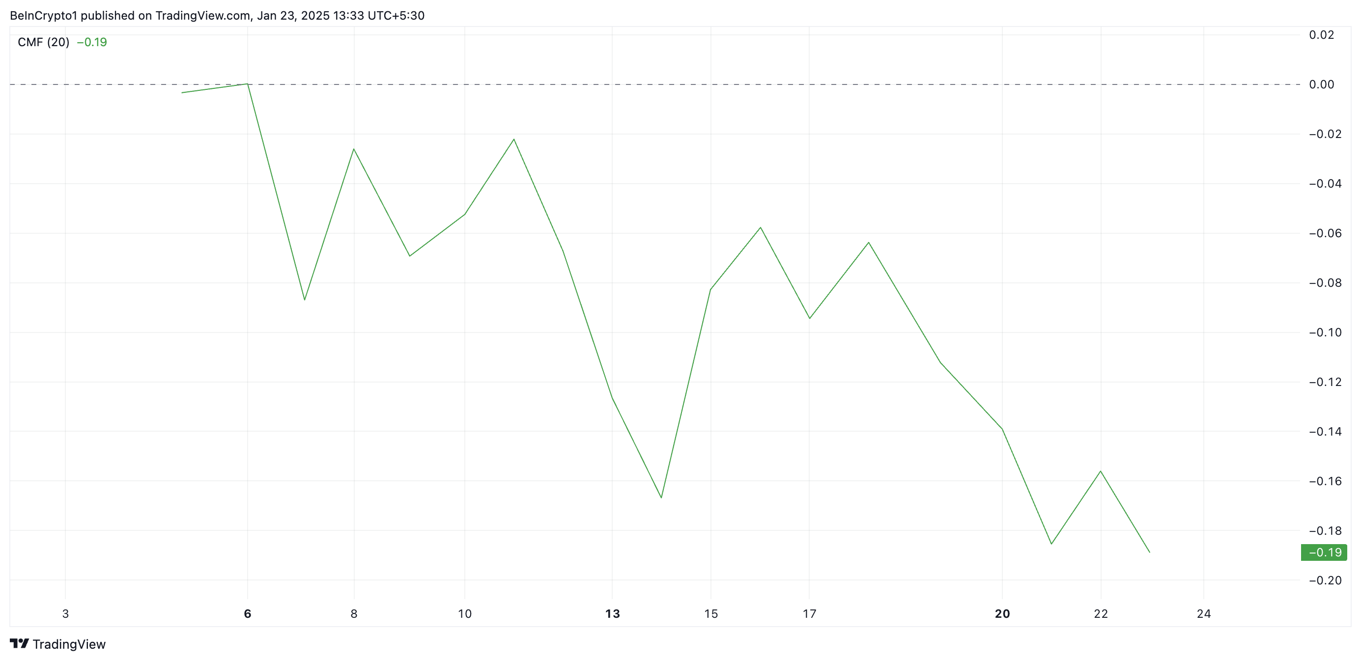 ขณะที่เขียนนี้ Chaikin Money Flow (CMF) ของ PENGU อยู่ต่ำกว่าศูนย์ที่ -0.19 บนกราฟรายวัน ซึ่งสร้างความแตกต่างในทางลบกับราคาที่เพิ่มขึ้นของโทเค็น บ่งบอกถึงการกลับตัวที่อาจเกิดขึ้น