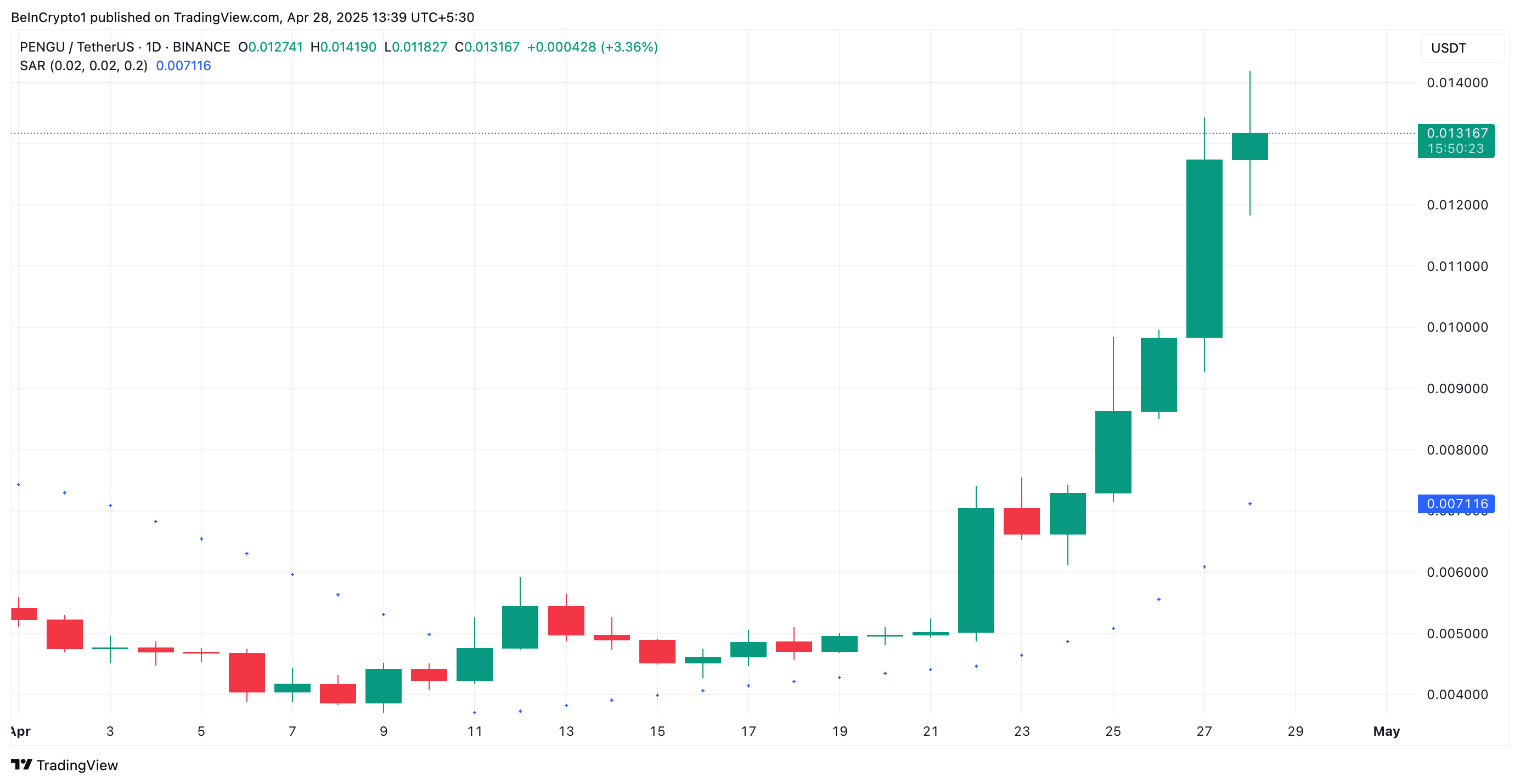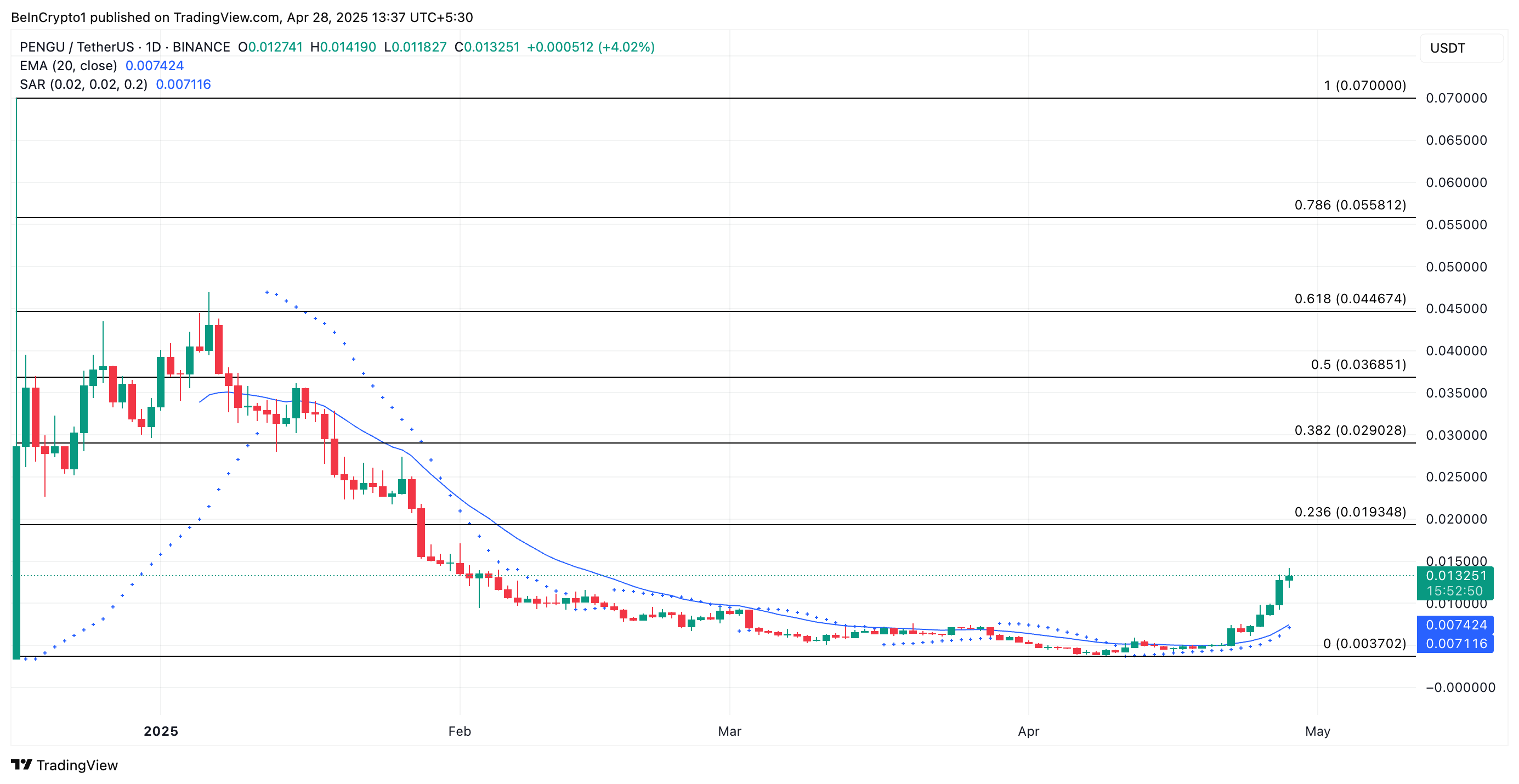 PENGU ได้แตะระดับสูงสุดในรอบสองเดือนที่ USD0.013 และปัจจุบันอยู่เหนือค่าเฉลี่ยเคลื่อนที่แบบเอ็กซ์โพเนนเชียล (EMA) 20 วัน