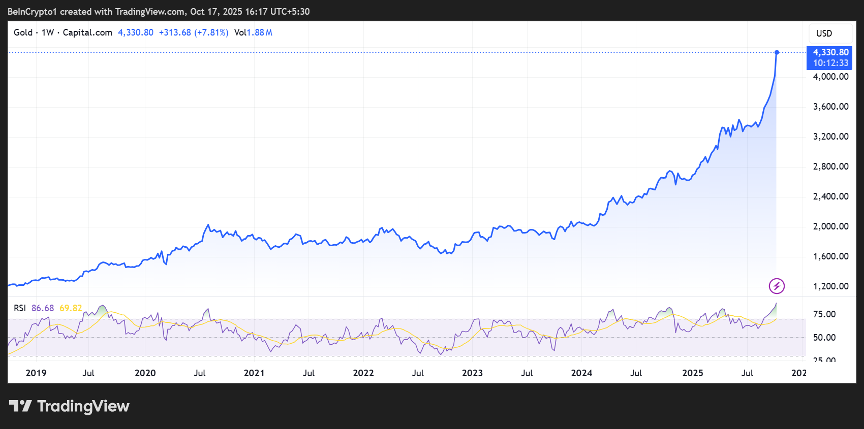 ณ เวลาที่เขียนนี้ ทองคำซื้อขายอยู่ที่ 4,330 USD ซึ่งเป็นราคาสูงสุดตลอดกาล โดยมี RSI (Relative Strength Index) แสดงถึงโมเมนตัมพาราโบลา