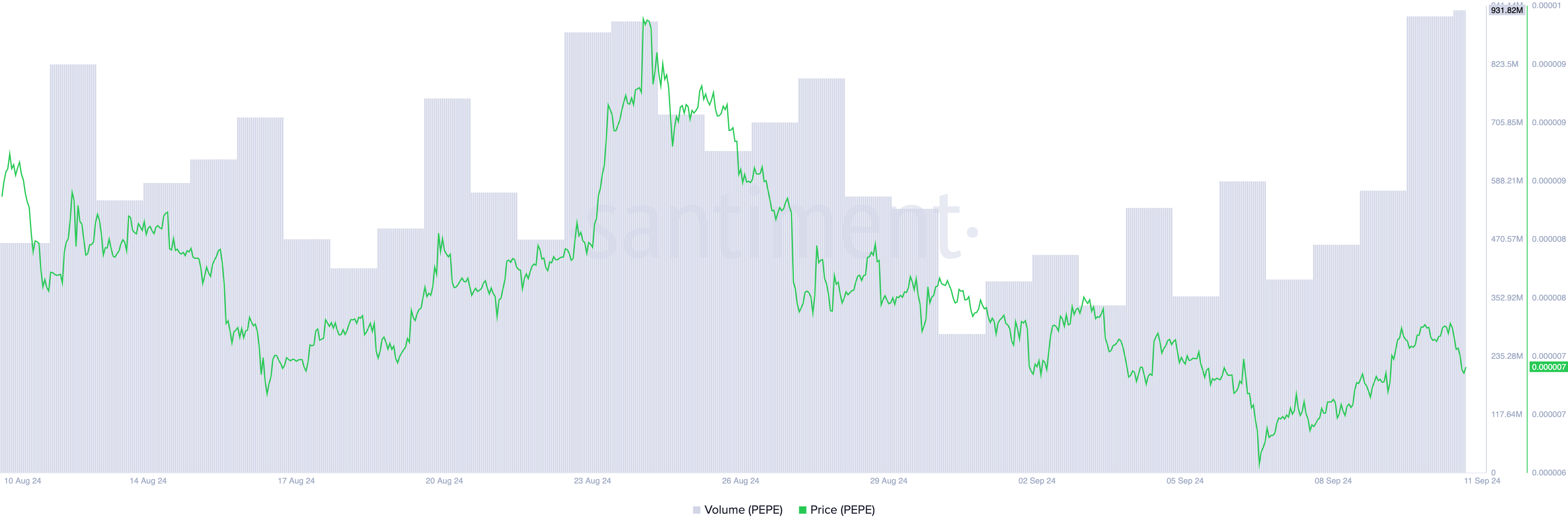 การเพิ่มขึ้นของปริมาณการซื้อขายโดยไม่มีการเพิ่มขึ้นของราคาบ่งชี้ถึงความสนใจในการซื้อที่อ่อนแอจากผู้เข้าร่วมตลาด PEPE