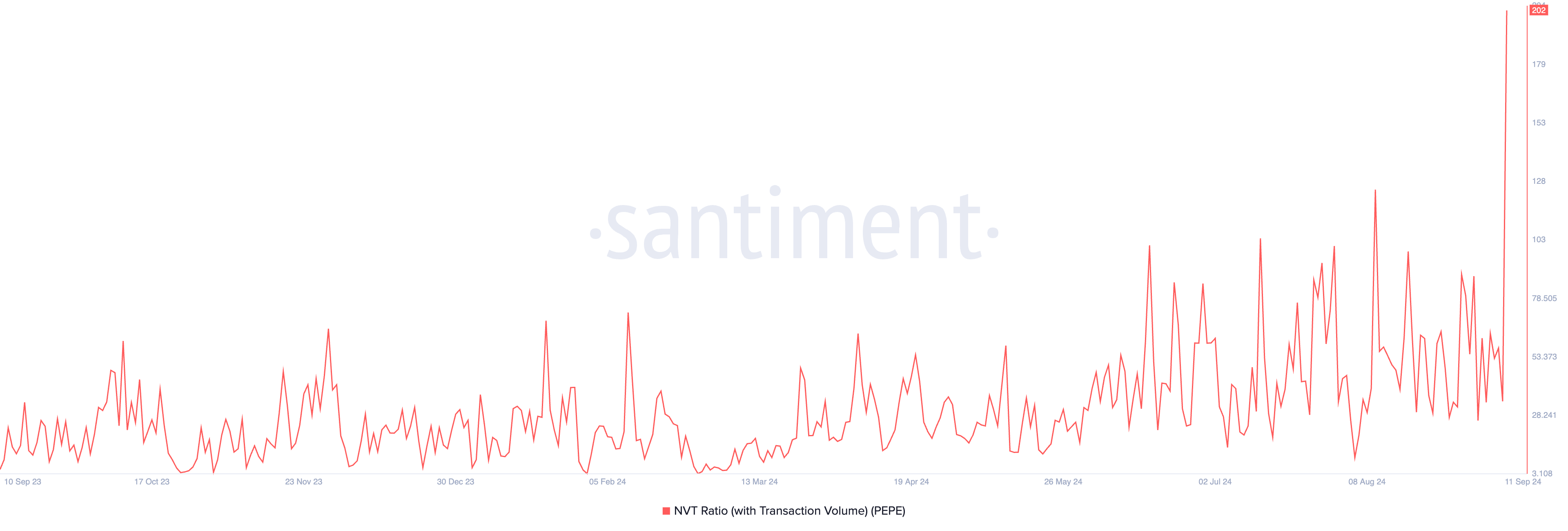 อัตราส่วนมูลค่าเครือข่ายต่อการทำธุรกรรม (NVT) ของ PEPE พุ่งสูงสุดนับตั้งแต่ต้นปี ตัวชี้วัดนี้เปรียบเทียบมูลค่าตลาดของ PEPE กับมูลค่าของโทเค็นที่ทำธุรกรรมในแต่ละวัน ปัจจุบันอยู่ที่ 202 โดยเพิ่มขึ้น 494% ในช่วง 24 ชั่วโมงที่ผ่านมา