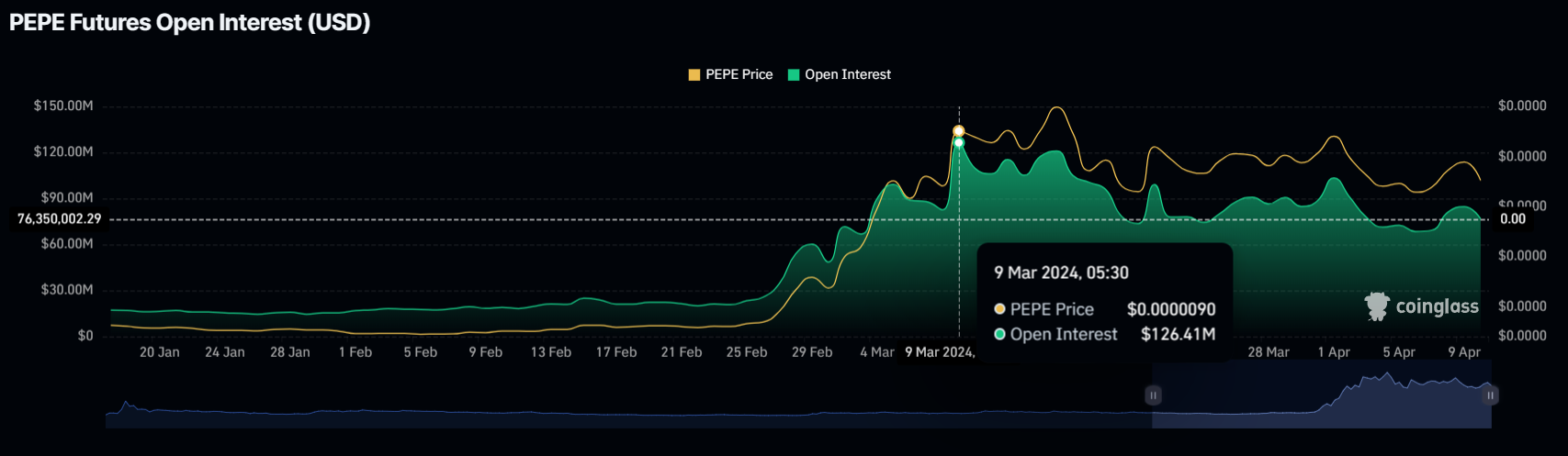 ในขณะนี้ OI ของ PEPE อยู่ที่ 76 ล้านดอลลาร์ลดลงจาก 126 ล้านดอลลาร์เมื่อน้อยกว่า 30 วันก่อน