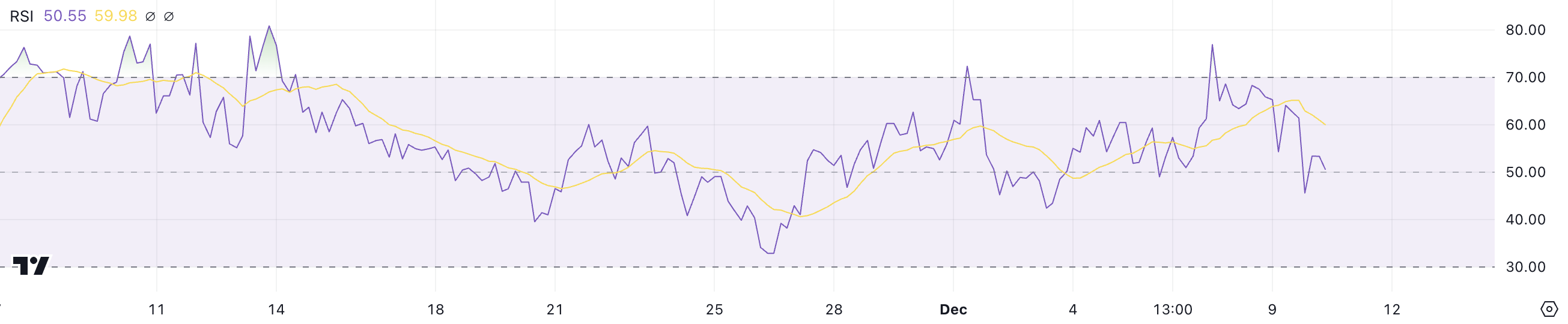 ดัชนีความแข็งแกร่งสัมพัทธ์ (RSI) เป็นออสซิลเลเตอร์ที่วัดความเร็วและการเปลี่ยนแปลงของการเคลื่อนไหวของราคา โดยมีช่วงตั้งแต่ 0 ถึง 100 RSI ที่สูงกว่า 70 มักบ่งชี้ว่าสินทรัพย์ถูกซื้อมากเกินไป ในขณะที่ RSI ต่ำกว่า 30 บ่งชี้ว่าถูกขายมากเกินไป