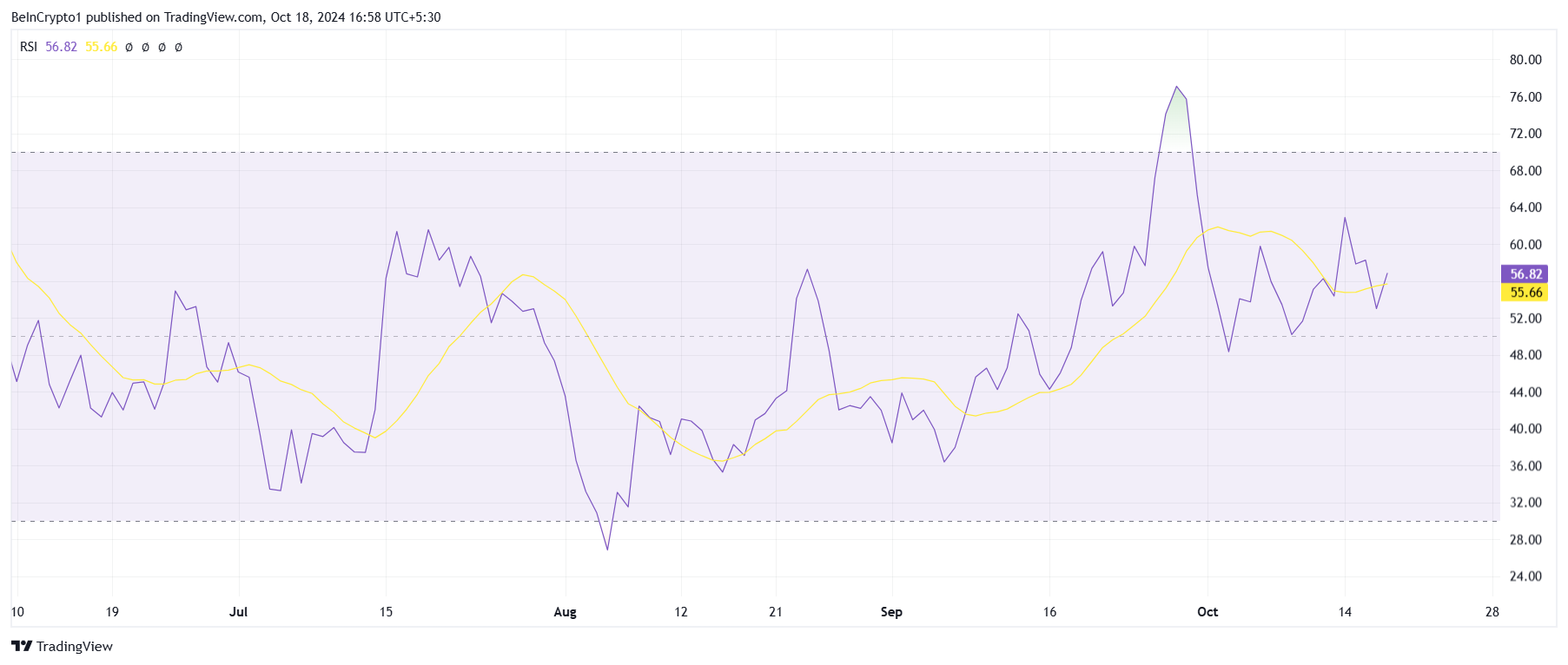 ในด้านเทคนิค แรงซื้อของ PEPE ดูแข็งแกร่งขึ้น ดัชนีความแข็งแกร่งสัมพัทธ์ (RSI) ซึ่งเป็นตัวชี้วัดสำคัญของความรู้สึกตลาด แสดงว่าแรงซื้อของเหรียญกำลังเพิ่มขึ้น