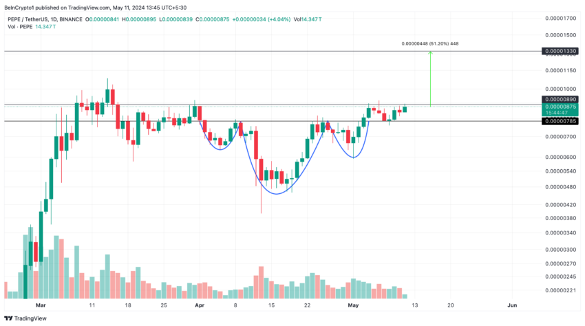 นอกจากนี้ การฟื้นตัวของ PEPE ยังได้รับการสนับสนุนในวันที่ 3 พฤษภาคม เมื่อทะลุออกจากรูปแบบกราฟ Head and Shoulders แบบผกผัน ซึ่งเป็นรูปแบบกราฟขาขึ้น เมื่อวันที่ 8 พฤษภาคม เหรียญมีมทดสอบขอบเสื้อผู้หญิงตอนหน้าอกของรูปแบบนี้อีกครั้งที่ 0.00000785 ดอลลาร์ และมีการเด้งกลับ 11%