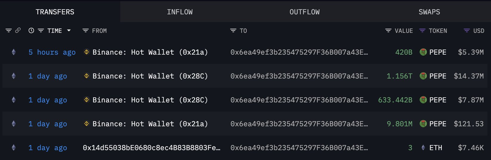 ผลที่ตามมา วาฬได้ถอนโทเค็น PEPE ออกไป 2.21 ล้านล้าน มูลค่า 29 ล้าน USD จาก Binance ในสองธุรกรรมแยกกันภายใน 24 ชั่วโมง