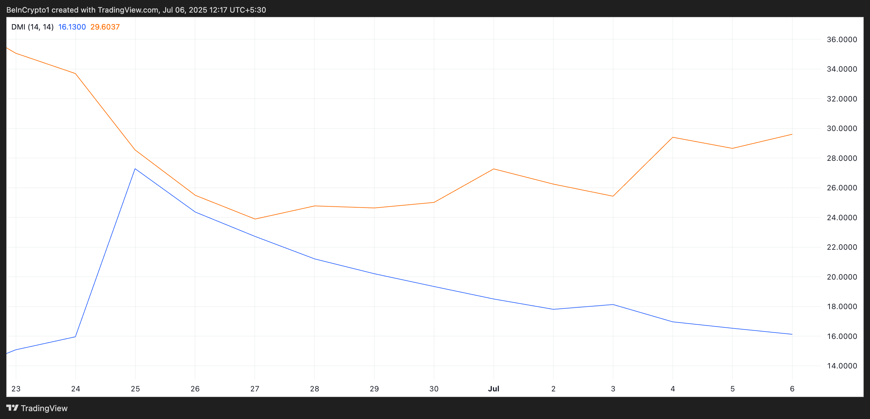 นอกจากนี้ การตั้งค่าของ Directional Movement Index (DMI) ของ PI สอดคล้องกับแนวโน้มตลาดหมีนี้ ดัชนีทิศทางบวกของโทเคน (+DI, สีน้ำเงิน) ปัจจุบันอยู่ต่ำกว่าดัชนีทิศทางลบ (-DI, สีส้ม) แสดงถึงแนวโน้มลบที่แข็งแกร่งขึ้น