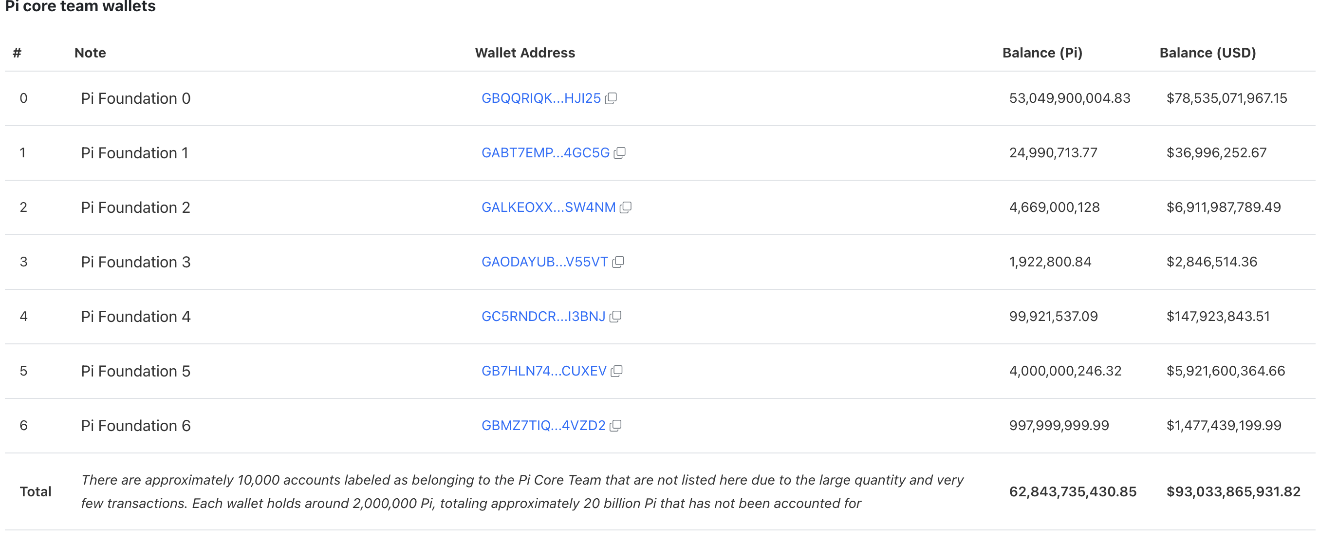 ข้อมูลล่าสุดเผยว่าทีมหลักของ Pi Network ควบคุม Pi Coin ประมาณ 62.8 พันล้านเหรียญในหกกระเป๋าเงิน นอกจากนี้ยังมี 20 พันล้าน PI อยู่ในกระเป๋าเงินที่ไม่ได้ลงทะเบียนประมาณ 10,000 ใบที่เป็นของทีม