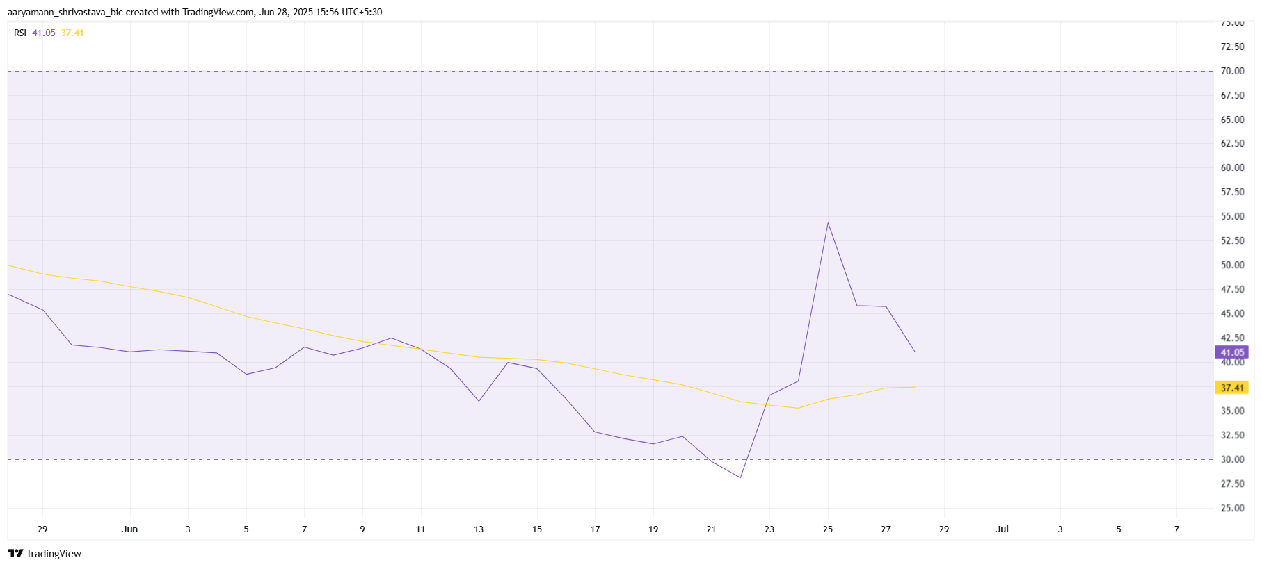 หลังจากความพยายามฟื้นตัวในช่วงสั้นๆ ในสัปดาห์นี้ RSI ไม่สามารถรักษาตำแหน่งเหนือจุดกลางได้ ยืนยันถึงการขาดแรงซื้อที่แข็งแกร่ง