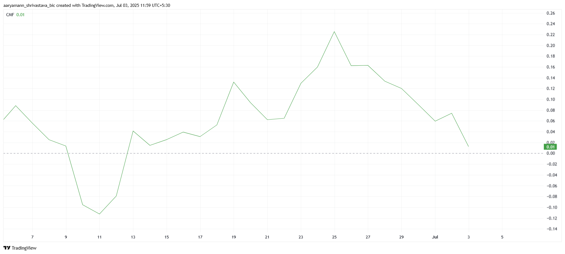 ตัวบ่งชี้ Chaikin Money Flow (CMF) กำลังแสดงสัญญาณของความรู้สึกที่แย่ลง สำหรับ Pi Coin CMF กำลังใกล้เส้นศูนย์ ซึ่งบ่งชี้ถึงการเปลี่ยนแปลงที่การไหลออกเริ่มมีอิทธิพลมากกว่าการไหลเข้า ในช่วงสามสัปดาห์ที่ผ่านมา Pi Coin ยังคงรักษาระดับความเชื่อมั่นของนักลงทุนไว้ได้บ้าง แต่ความเชื่อมั่นนั้นกำลังลดลง