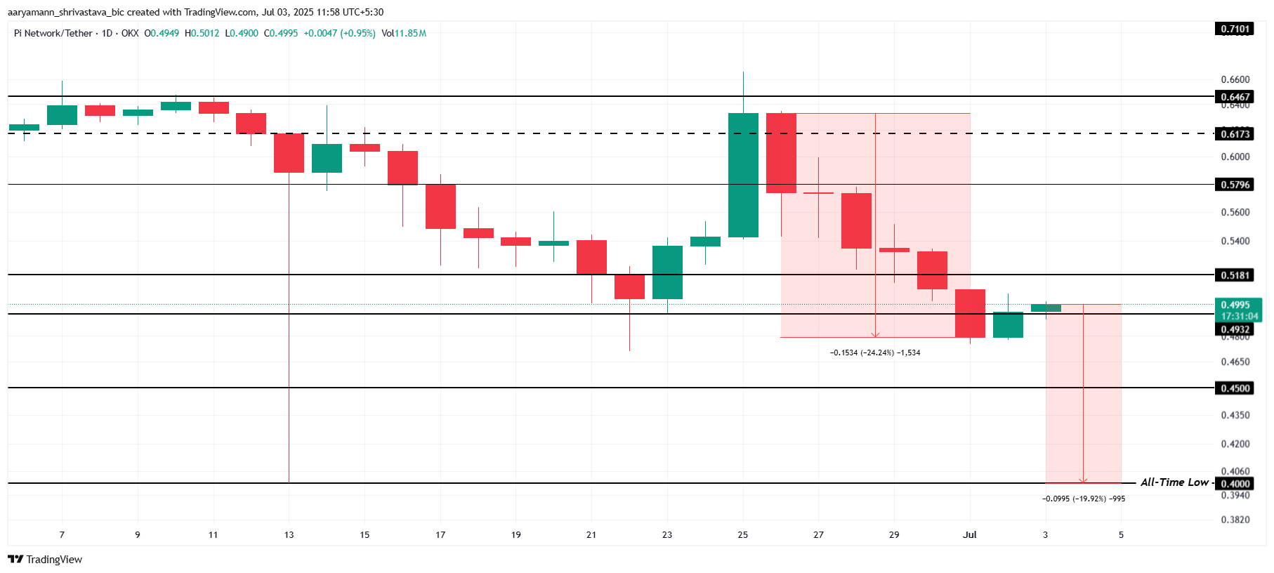 ราคาของ Pi Coin ปัจจุบันอยู่ที่ประมาณ USD 0.499 ซึ่งสูงกว่าระดับต่ำสุดตลอดกาลที่ USD 0.400 ประมาณ 20% อย่างไรก็ตาม สภาพแวดล้อมตลาดโดยรวมบ่งชี้ว่าการลดลงเพิ่มเติมอาจเกิดขึ้นได้ ด้วยความรู้สึกเชิงลบที่ยังคงมีอยู่และความเชื่อมั่นใน Pi Coin ที่ลดลง altcoin นี้อาจประสบปัญหาในการรักษาระดับปัจจุบันไว้ได้