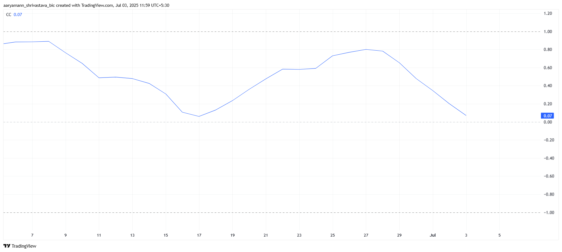 นอกจากนี้ ความสัมพันธ์ระหว่าง Pi Coin และ Bitcoin ได้ลดลงอย่างต่อเนื่อง ปัจจุบันความสัมพันธ์อยู่ที่เพียง 0.07 ซึ่งแตกต่างอย่างมากจากความสัมพันธ์เชิงบวกที่ coin ทั้งสองเคยมี