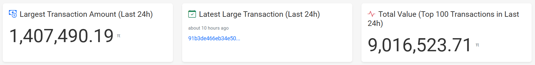 การมีส่วนร่วมของนักลงทุนที่ขาดแคลนกลายเป็นสิ่งที่เห็นได้ชัดมากขึ้นบนเครือข่าย ข้อมูลจาก 100 การทำธุรกรรมชั้นนำใน 24 ชั่วโมงที่ผ่านมาแสดงให้เห็นว่า มีเพียงเล็กกว่า 9 ล้าน PI เคลื่อนที่ผ่านเครือข่าย มูลค่าการทำธุรกรรมอยู่ที่ต่ำกว่า 2.45 ล้าน USD ซึ่งเผยให้เห็นปริมาณการทำธุรกรรมที่น้อยมากที่สนับสนุนสินทรัพย์นี้