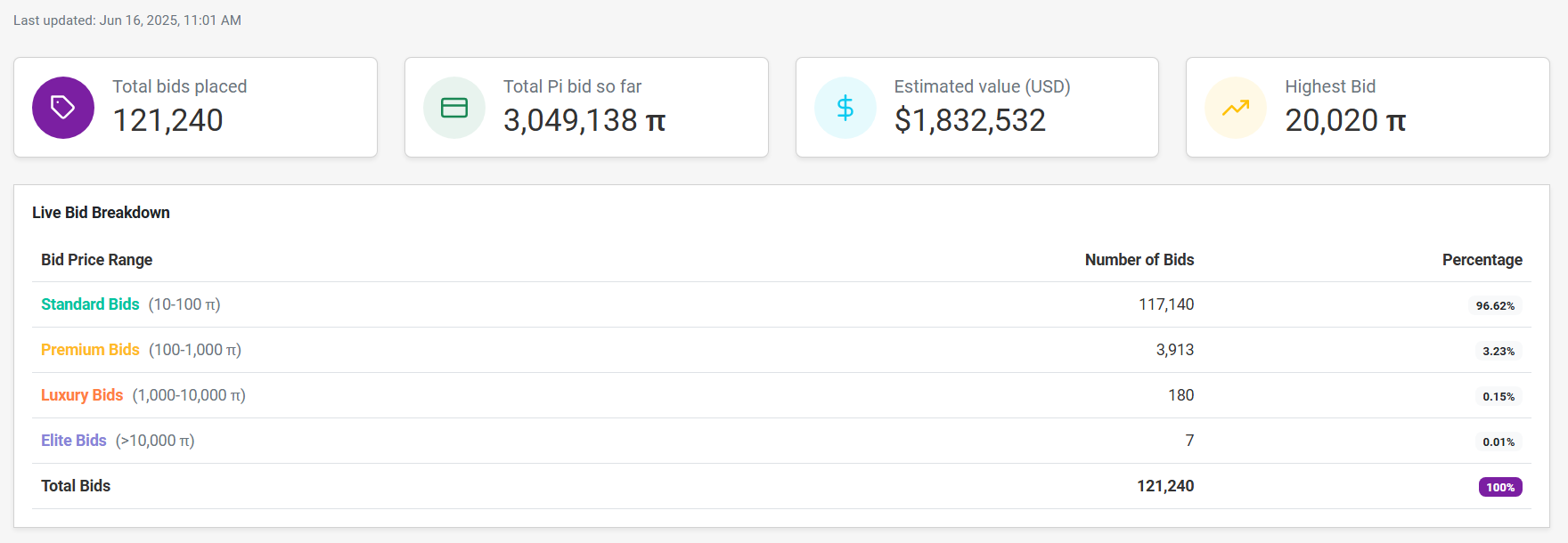 ตามข้อมูลจาก Piscan ในช่วงเวลากว่าสามเดือนนับตั้งแต่การประมูลเริ่มต้น มีการใช้โทเค็น Pi กว่า 3 ล้านเหรียญในการประมูลโดเมน รวมมูลค่ากว่า 1.8 ล้าน USD อย่างไรก็ตาม ตัวเลขนี้ค่อนข้างเล็กเมื่อเทียบกับ ปริมาณการซื้อขายรายวันกว่า 100 ล้าน USD ซึ่งหมายความว่าไม่น่าจะมี ผลกระทบต่อราคาของ Pi อย่างมีนัยสำคัญ