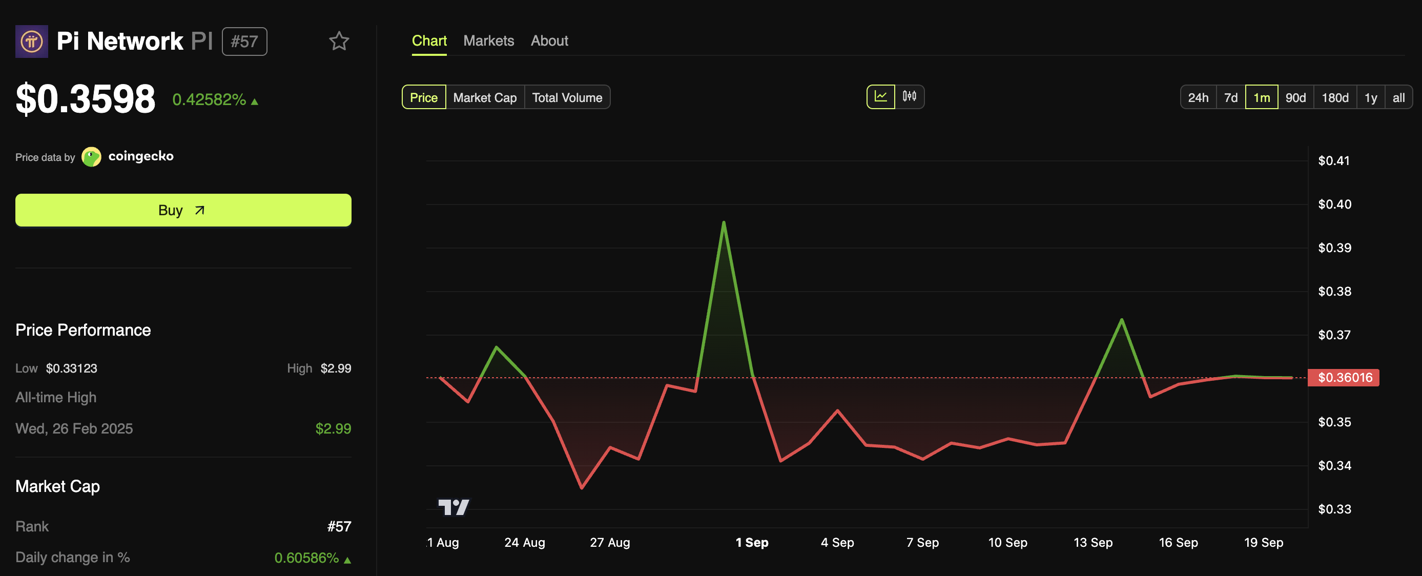 ในขณะเดียวกัน หลังการเปิดตัว Pi Coin ได้เพิ่มขึ้นเล็กน้อยท่ามกลางแนวโน้มขาลงที่กว้างขึ้น ข้อมูลจาก BeInCrypto Markets แสดงให้เห็นว่า PI เพิ่มขึ้น +0.42% ในวันก่อนหน้า ขณะที่เขียนอยู่นี้ มันกำลังซื้อขายที่ USD0.359