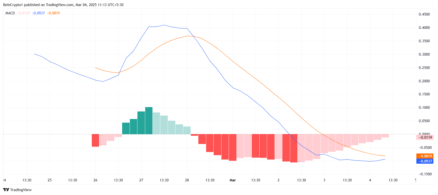แม้จะมีสัญญาณการฟื้นตัว แต่ดัชนี Relative Strength Index (RSI) ยังคงต่ำกว่าระดับกลางที่ 50.0 บ่งบอกถึงความเชื่อมั่นแบบ bearish ที่ยังคงอยู่ จนกว่า RSI จะเข้าสู่เขต bullish การเคลื่อนไหวของราคาของ Pi Network อาจยังคงช้าและไม่แน่นอน สภาพแวดล้อมของตลาดโดยรวมยังคงเป็นความท้าทายสำหรับ altcoins