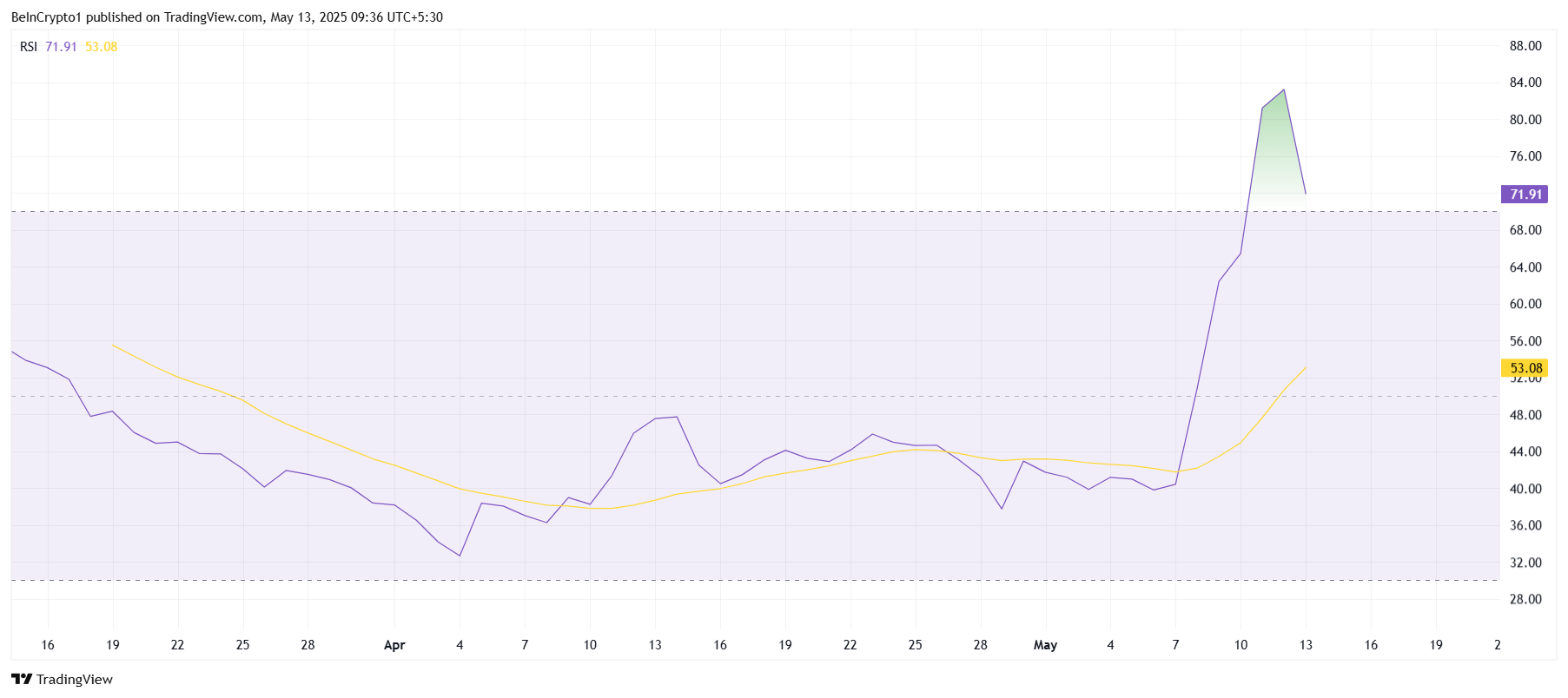 ดัชนีความแข็งแกร่งสัมพัทธ์ (RSI) สำหรับ Pi Network ได้พุ่งขึ้น เหนือเกณฑ์ 70.0 เข้าสู่โซนที่ซื้อมากเกินไป ซึ่งบ่งชี้ว่าแรงกระตุ้นขาขึ้นกำลังอิ่มตัว ซึ่งตามประวัติศาสตร์มักจะส่งสัญญาณการกลับตัวที่อาจเกิดขึ้น