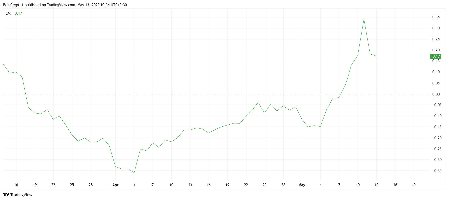 เมื่อมองไปที่แรงกระตุ้นที่กว้างขึ้น ตัวบ่งชี้ Chaikin Money Flow (CMF) สำหรับ Pi Network อยู่เหนือเส้นศูนย์อย่างมาก ซึ่งบ่งชี้ถึงการไหลเข้าที่แข็งแกร่ง แม้ว่า CMF จะแสดงการลดลงเมื่อเร็วๆ นี้ แต่คาดว่าจะไม่คงอยู่เป็นเวลานาน โดยเฉพาะอย่างยิ่งเมื่อพิจารณาถึงความแข็งแกร่งของตลาด