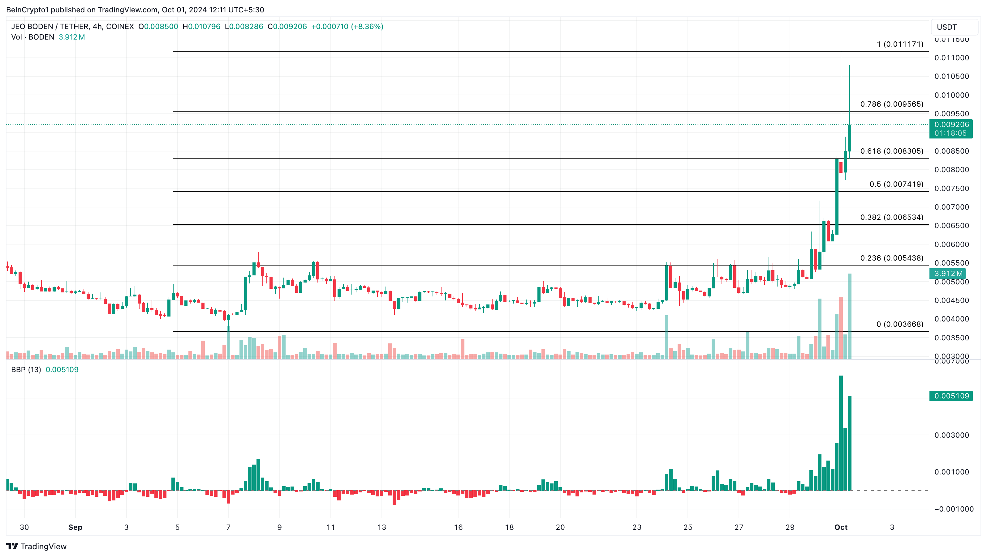 ณ เวลานี้ ราคาของ BODEN อยู่ที่ 0.0092 USD ตามกราฟ 4 ชั่วโมง Bull Bear Power (BBP) ได้แสดงแถบฮิสโตแกรมสีเขียวที่สูงขึ้น BBP วัดความแข็งแกร่งของผู้ซื้อเทียบกับผู้ขาย เมื่อมันเพิ่มขึ้น ผู้ซื้อ (bulls) มีอำนาจควบคุมและราคาอาจเพิ่มขึ้น