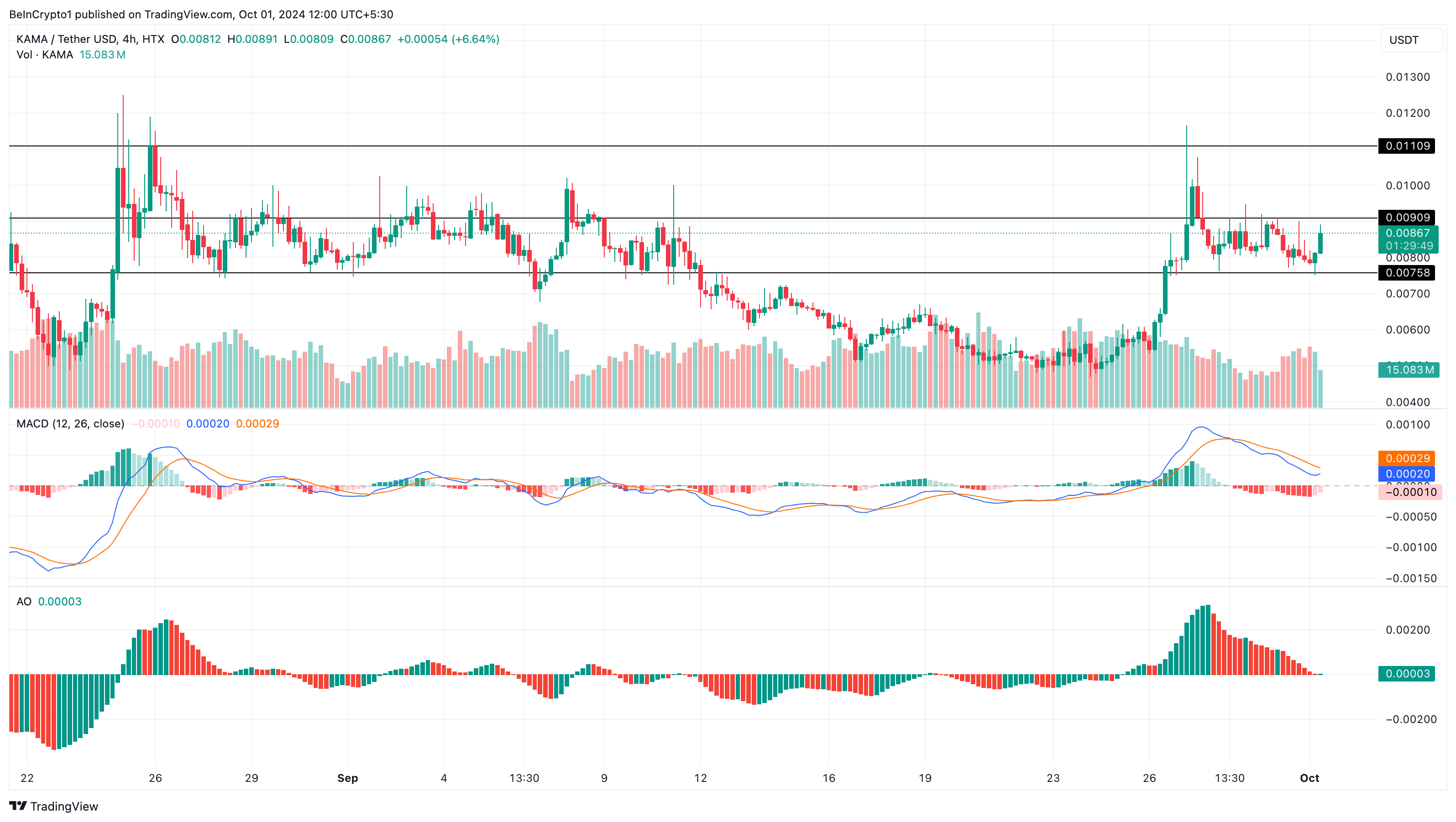 แม้จะมีกำไรอย่างมาก แต่กราฟ 4 ชั่วโมงแสดงให้เห็นว่าราคาของ KAMA อาจพบกับความท้าทายในการรักษาแนวโน้มขาขึ้น สาเหตุหลักมาจาก Awesome Oscillator (AO) และ Moving Average Convergence Divergence (MACD) ซึ่งเป็นตัวชี้วัดโมเมนตัมที่กำลังหันลง