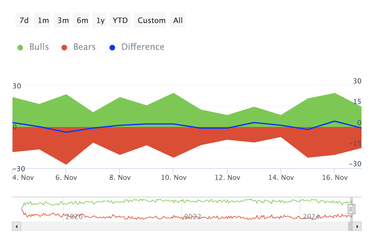 นอกจากนี้ การเพิ่มขึ้นของการสะสมโดยวาฬยังสอดคล้องกับการเพิ่มขึ้นของความเป็นผู้นำเชิงบวก ตามที่ได้รับการเน้นโดยตัวบ่งชี้ Bulls and Bears ของ IntoTheBlock ตัวชี้วัดนี้ติดตามกิจกรรมของนักลงทุนที่ซื้อ Bulls อย่างน้อย 1% ของปริมาณการซื้อขายทั้งหมดเทียบกับผู้ที่ขาย Bears ในปริมาณที่คล้ายกัน