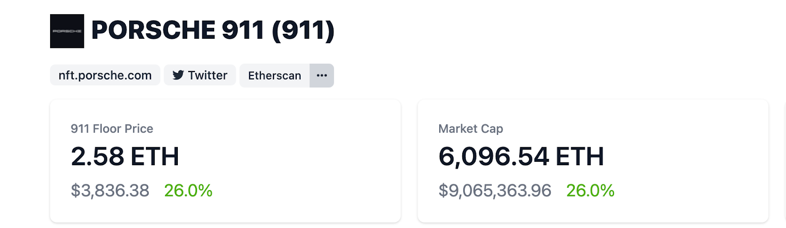 ตามข้อมูลจาก CoinGecko ราคาพื้นและมูลค่าตลาดของ Porsche 911 เพิ่มขึ้น 26% ในวันจันทร์ที่ผ่านมา มูลค่าตามราคาตลาดของคอลเล็กชันคือ 6,096.54 ETH ประมาณ 9 ล้านดอลลาร์สหรัฐ