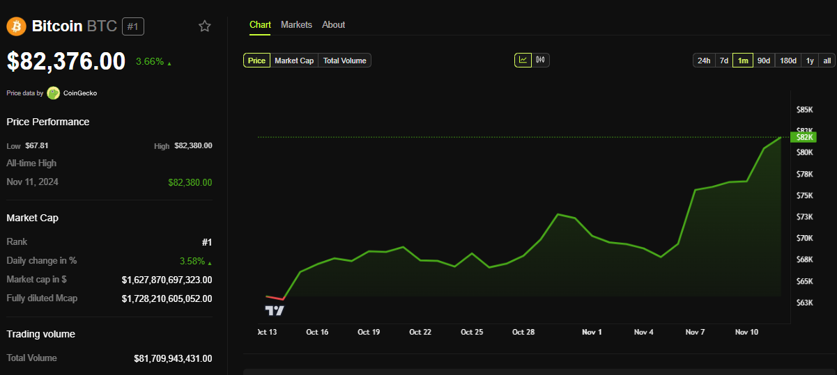 ณ เวลาที่เขียนนี้ Bitcoin มีราคาอยู่ที่ USD 82,376 โดยเพิ่มขึ้นเกือบ 4% นับตั้งแต่เปิดตลาดวันจันทร์ ขณะที่ราชาแห่งคริปโตดูเหมือนจะมีแนวโน้มที่จะเพิ่มขึ้นอีก ข้อมูลเศรษฐกิจของสหรัฐฯ ในสัปดาห์นี้ที่เป็นบวก อาจส่ง BTC ไปยังดินแดนที่ไม่เคยมีมาก่อน