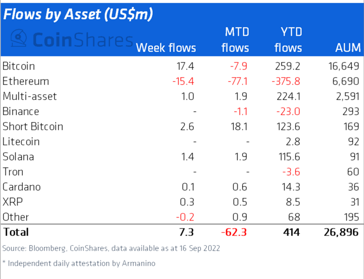 จากรายงานล่าสุดของ Digital Asset Fund Flow Weekly ทาง CoinShares รายงานว่ากระแสหลัง Ethereum Merge นักลงทุนยังคงเพิ่มความระมัดระวังอย่างต่อเนื่อง พบว่า Fundflow ไหลออก 4 สัปดาห์ติดต่อกัน สัปดาห์ที่แล้ว 15 ล้านดอลลาร์ ขณะที่ยอดรวมตั้งแต่ต้นปีอยู่ที่ 375.8 ล้านดอลลาร์ซึ่งเป็นจำนวนที่น่าตกใจ