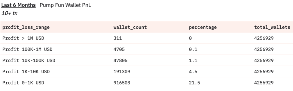 จากข้อมูลนี้ ท้าทายเรื่องราวที่ว่า Pump.fun ทำให้การเงินเป็นประชาธิปไตย โดย 95.6% ของกระเป๋าเงิน (312,191) ได้รับผลขาดทุนหรือเท่าทุน
