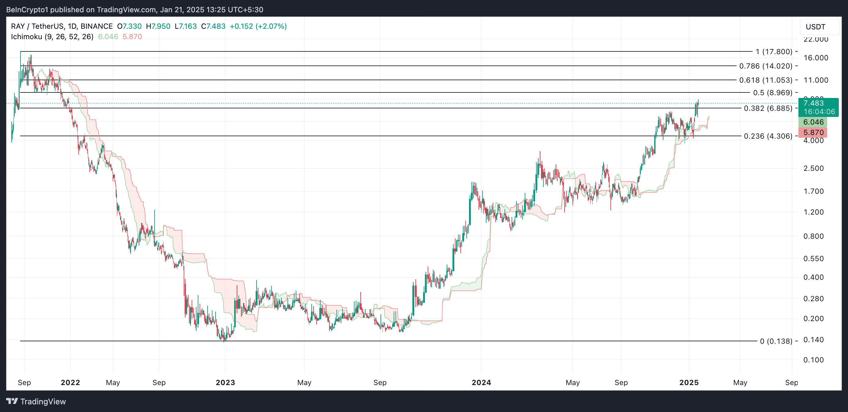 การประเมินแผนภูมิรายวันของ RAY/USD เผยให้เห็นถึงความต้องการที่เพิ่มขึ้นสำหรับ altcoin นี้ ซึ่งแสดงให้เห็นจากการตั้งค่าของ Ichimoku Cloud ที่มี Leading Spans A และ B เป็นการสนับสนุนแบบไดนามิกที่ต่ำกว่าราคาของโทเค็นที่ USD 6.04 และ USD 5.87 ตามลำดับ