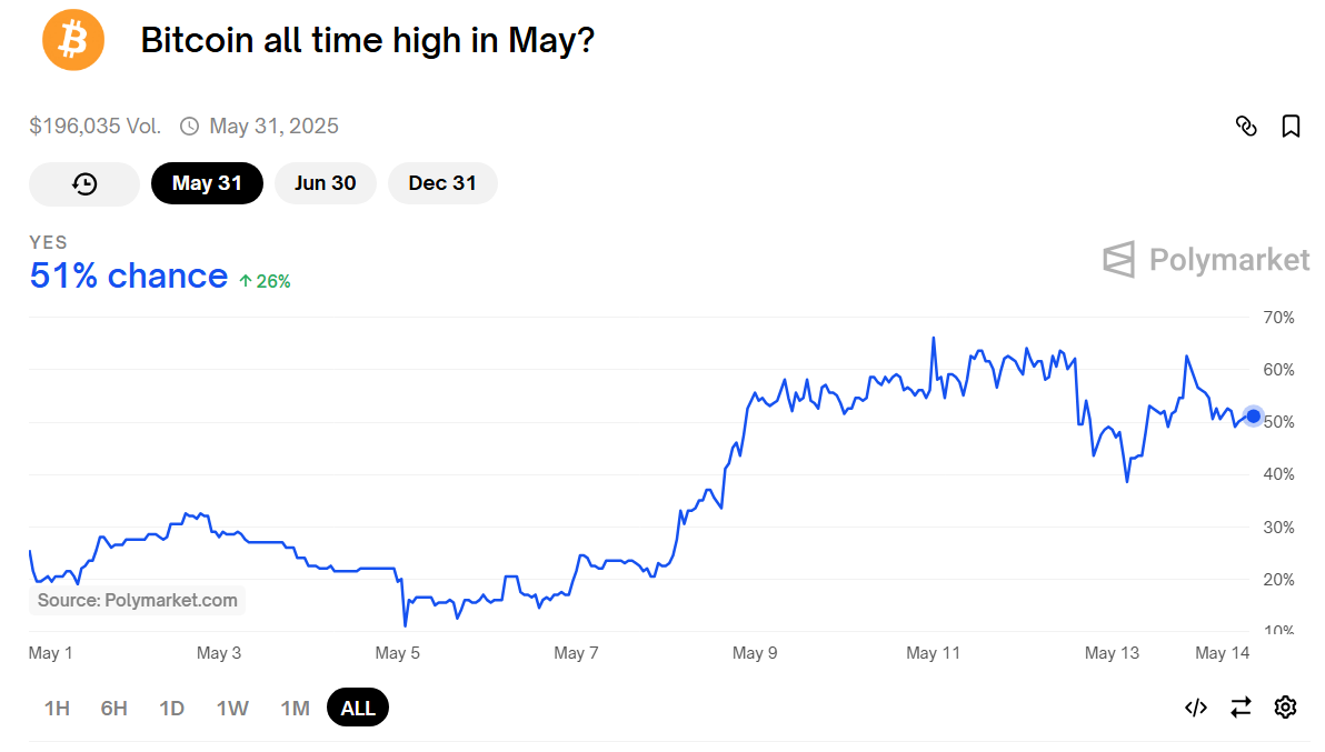 สุดท้าย ตลาดการทำนาย Polymarket แสดงให้เห็นว่าความน่าจะเป็นที่ Bitcoin จะถึงจุดสูงสุดใหม่ในเดือนพฤษภาคมเพิ่มขึ้นจาก 11% เป็น 60% ปัจจุบันอยู่ที่ 51% Polymarket อนุญาตให้ผู้ใช้เดิมพันในเหตุการณ์ในอนาคต และการเปลี่ยนแปลงนี้สะท้อนถึงความเชื่อมั่นที่เพิ่มขึ้นในชุมชน