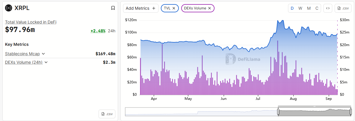 สัญญาณที่น่ากังวลที่สองมาจากการลดลงของมูลค่ารวมที่ถูกล็อก (TVL) บน XRP Ledger (XRPL) ซึ่งแสดงถึงการไหลออกของเงินทุนจากระบบนิเวศ ข้อมูลจาก DeFiLlama เผยว่า TVL ของ XRPL ลดลงจาก 120 ล้าน USD เหลือประมาณ 98 ล้าน USD ในช่วงสองเดือนที่ผ่านมา