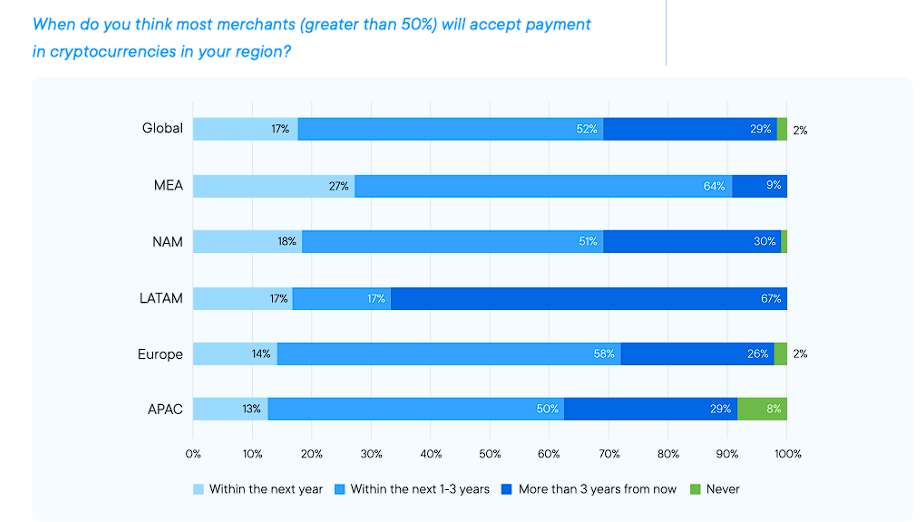 ผู้ตอบแบบสำรวจ 50% มั่นใจว่าบริษัทร้านค้ายักษ์ใหญ่จะยอมรับการชำระเงินด้วยคริปโตภายในอีก 3 ปีข้างหน้า ทว่า ยังมีความเห็นที่ต่างกันว่าเหตุการณ์ดังกล่าวจะเกิดขึ้นภายในปีหน้าหรือไม่