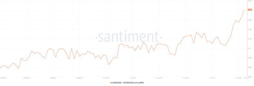 ตามพอร์ทัลข้อมูลการวิเคราะห์บนเครือข่าย ผู้ถือ XRP ที่เป็นเจ้าของ Token ระหว่าง 1 ล้านถึง 10 ล้านโทเค็นได้เพิ่มยอดคงเหลือในช่วงเจ็ดวันที่ผ่านมา