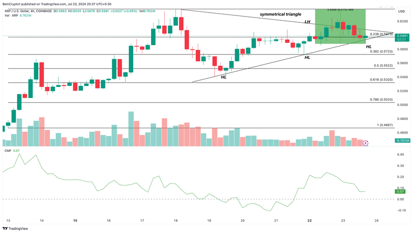 กราฟ XRP/USD 4 ชั่วโมงแสดงการก่อตัวของสามเหลี่ยมสมมาตร สามเหลี่ยมสมมาตรจะปรากฏขึ้นเมื่อเส้นแนวโน้มสองเส้นที่บรรจบกันเชื่อมต่อชุดของจุดสูงสุดที่ต่ํากว่า LH และจุดต่ำสุดที่สูงขึ้น HL