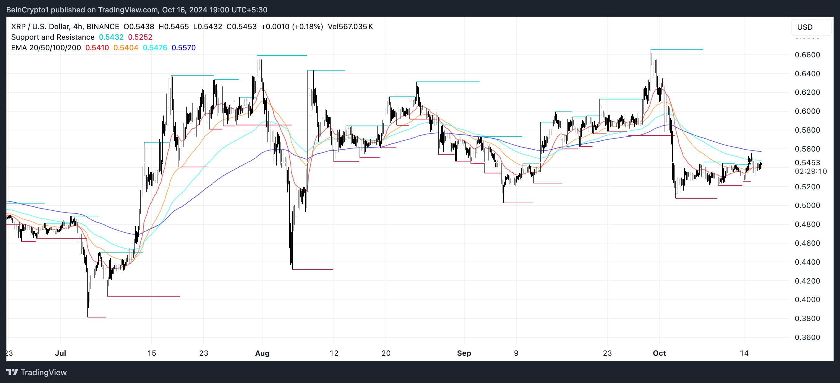 เส้น EMA ยังคงอยู่ในแนวโน้มขาลง แม้ว่าการตัดกันในทางบวกอาจจะเกิดขึ้นในไม่ช้า หากแรงกดดันในการซื้อเพิ่มขึ้น XRP อาจสามารถทะลุผ่านระดับต้านทานสำคัญในอีกไม่กี่วันข้างหน้า