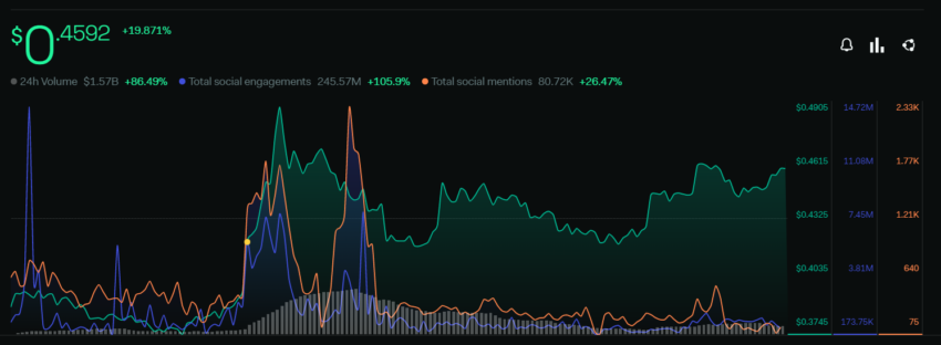 ในช่วงเวลาดังกล่าว XRP มีผู้ร่วมสนับสนุนโซเชียลที่ไม่ซ้ำรายกันมากถึง 3,440 รายต่อชั่วโมงสำหรับโทเค็น ผู้ใช้งานหลายคนในชุมชน XRP ผลักดันโทเค็นบนโซเชียลมีเดียอย่างแข็งขัน เนื่องจากพวกเขาเชื่อว่าบริษัทแม่อย่าง Ripple จะชนะคดีต่อสำนักงาน ก.ล.ต. ของสหรัฐฯ