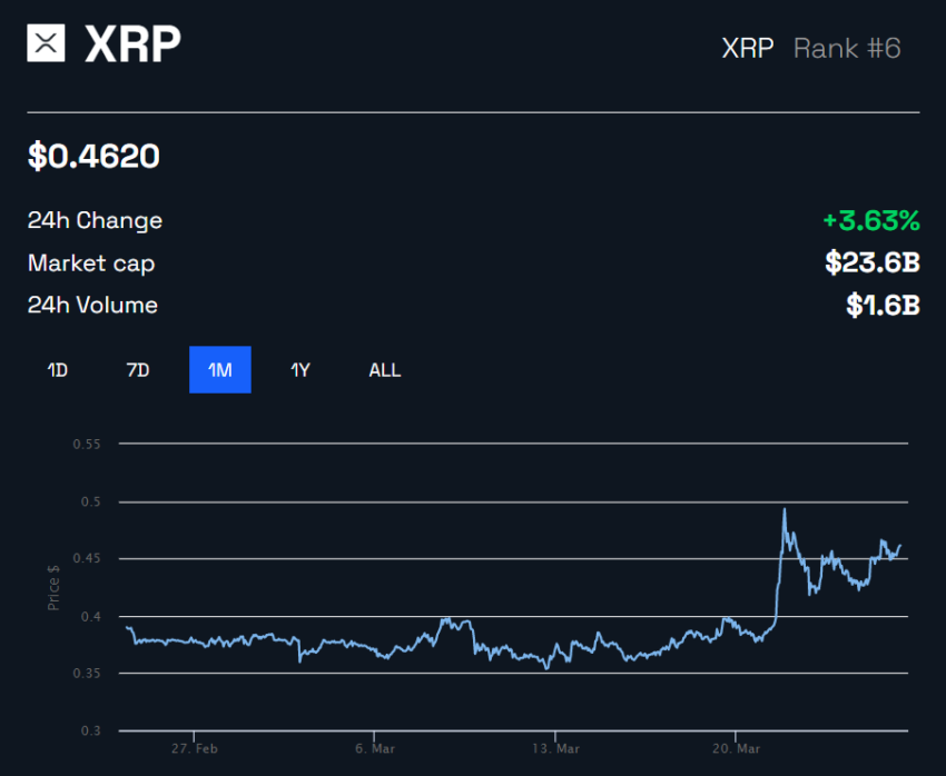 ในช่วง 24 ชั่วโมงที่ผ่านมาเพียงอย่างเดียว มูลค่าของ XRP เพิ่มขึ้น 3.63% เป็น 0.46 ดอลลาร์สหรัฐฯ ซึ่งผลักดันมูลค่าตลาดเป็น 2.36 แสนล้านดอลลาร์สหรัฐฯ ตามข้อมูลของ BeInCrypto