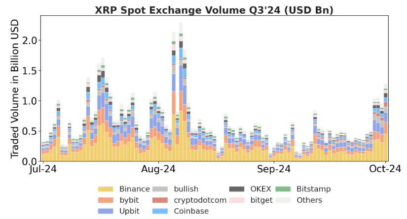 ในขณะเดียวกัน ความสนใจจากสถาบันที่เพิ่มขึ้นนำไปสู่ปริมาณการซื้อขาย XRP ที่สูงขึ้น ปริมาณการซื้อขายเฉลี่ยต่อวัน (ADV) ในตลาดหลักอยู่ระหว่าง 600 ล้านถึง 700 ล้าน USD โดยมีการเพิ่มขึ้น 27% ในอัตราส่วน XRP/BTC ในไตรมาสนี้ Ripple อธิบายว่าการซื้อขายใน Binance, Bybit และ Upbit มีปริมาณเฉลี่ยประมาณ 750 ล้าน USD ในช่วงต้นไตรมาสที่ 3 ก่อนที่จะคงที่ในช่วงกลางไตรมาสและเพิ่มขึ้นอีกครั้งในช่วงสุดท้ายของเดือนกันยายน