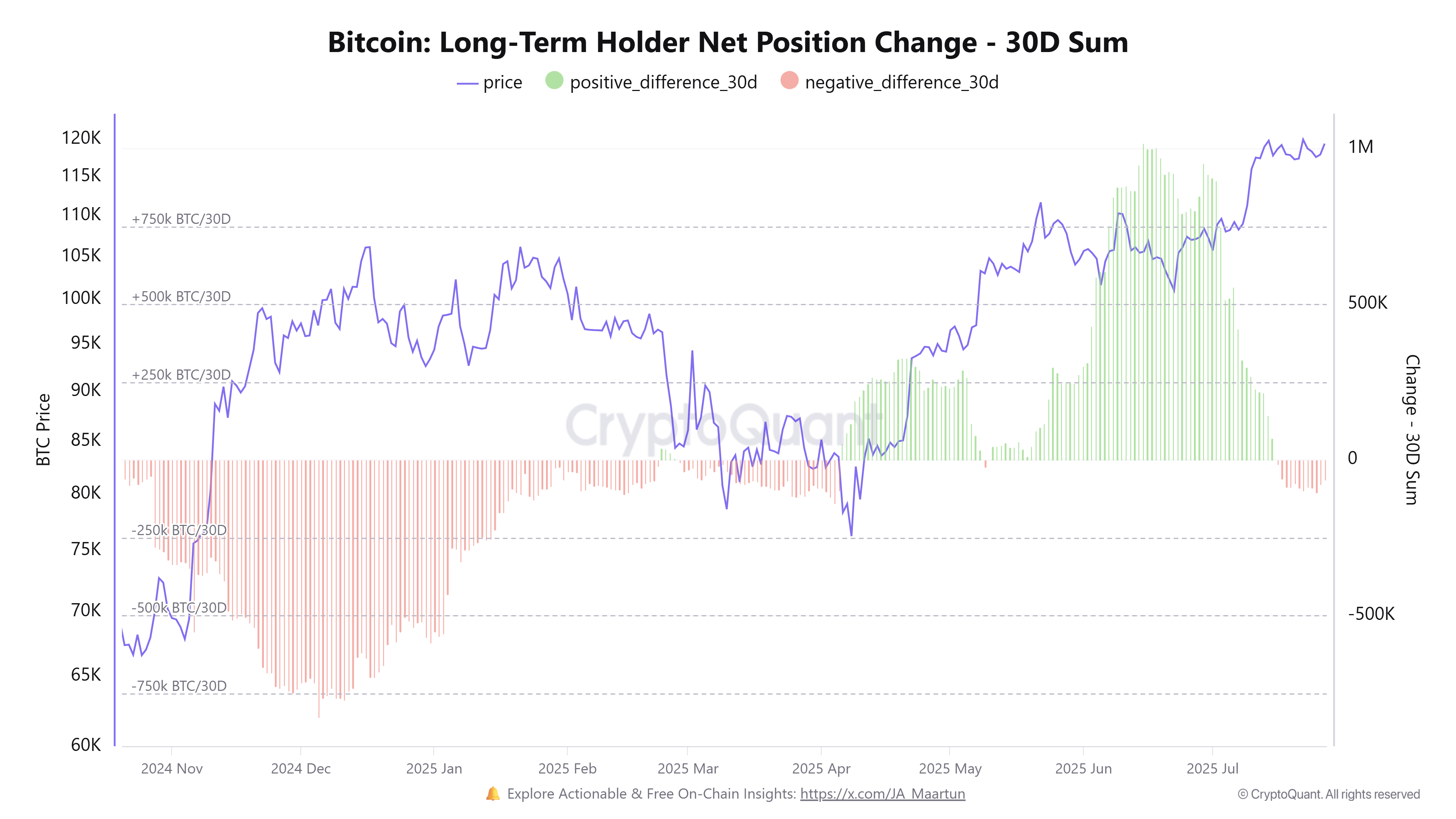 ตามรายงานของ CryptoQuant นักลงทุนระยะยาว (LTHs) เริ่มถอนเงินเมื่อ BTC อยู่ราวๆ 120,000 USD ในช่วงปลายเดือนกรกฎาคม พฤติกรรมนี้อาจสะท้อนถึงความระมัดระวัง ซึ่งนักลงทุนหลายคนเลือกที่จะล็อกกำไรแทนที่จะถือครองต่อไปท่ามกลางความผันผวนที่อาจเกิดขึ้น