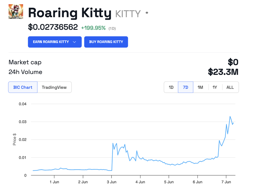 เหรียญมีมกําลังประสบกับการเพิ่มขึ้นอย่างมากหลังจากการประกาศโดย Keith Gill หรือที่รู้จักกันอย่างกว้างขวางในชื่อ Roaring Kitty หรือ DeepF kingValue Gill เปิดเผยแผนการสําหรับการ stream สดของ YouTube ที่กําลังจะมีขึ้นในวันที่ 7 มิถุนายน เวลา 16:00 UTC