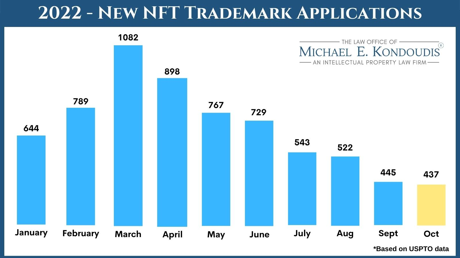 Mike Kondoudis ระบุว่ามีการยื่นขอจดทะเบียนเครื่องหมายการค้าของสหรัฐฯ ที่เกี่ยวข้องกับสินค้า/บริการที่เกี่ยวข้องกับ Cryptocurrency กว่า 4,708 รายการ ในขณะเดียวกัน มีคำขอจดทะเบียนเครื่องหมายการค้าที่เกี่ยวกับ Metaverse และสินค้า/บริการเสมือนจริงกว่า 4,997 รายการ สุดท้าย มีการยื่นขอจดทะเบียนเครื่องหมายการค้าของสหรัฐฯ สำหรับ NFT และสินค้า/บริการที่เกี่ยวข้องเป็นจำนวน 6,855 รายการ ซึ่งมากกว่ายอดรวมในปี 2021 ถึง 3 เท่า ซึ่งในปีที่ผ่านมา แบรนด์ต่างๆ มีการยื่นขอจดทะเบียนรวม 2,142 รายการเท่านั้น แค่เพียง 3 เดือนแรกของปี 2022 จำนวนรวมของการยื่นขอจดทะเบียนก็ได้แซงหน้าตัวเลขในปี 2021 ไปแล้ว