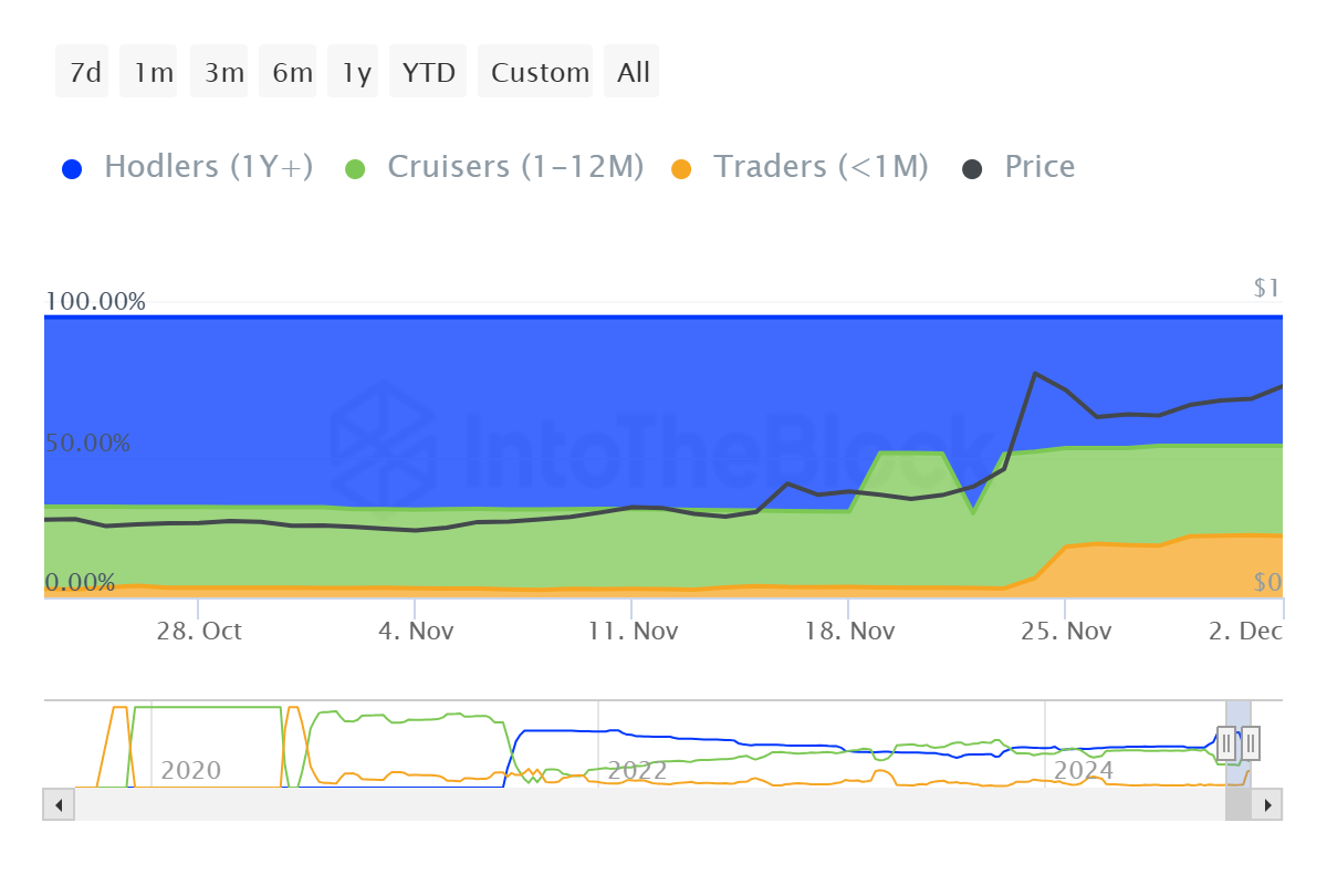 การมีผู้ถือครองระยะสั้นในสัดส่วนสูงนี้หมายความว่าการขายออกที่สำคัญโดยกลุ่มนี้อาจนำไปสู่การปรับราคาลง ผู้ถือครองระยะสั้นมักจะตอบสนองต่อการเคลื่อนไหวของตลาดอย่างรวดเร็ว และหากพวกเขาเลือกที่จะล็อกกำไร อาจทำให้เกิดแรงกดดันต่อราคาลงได้