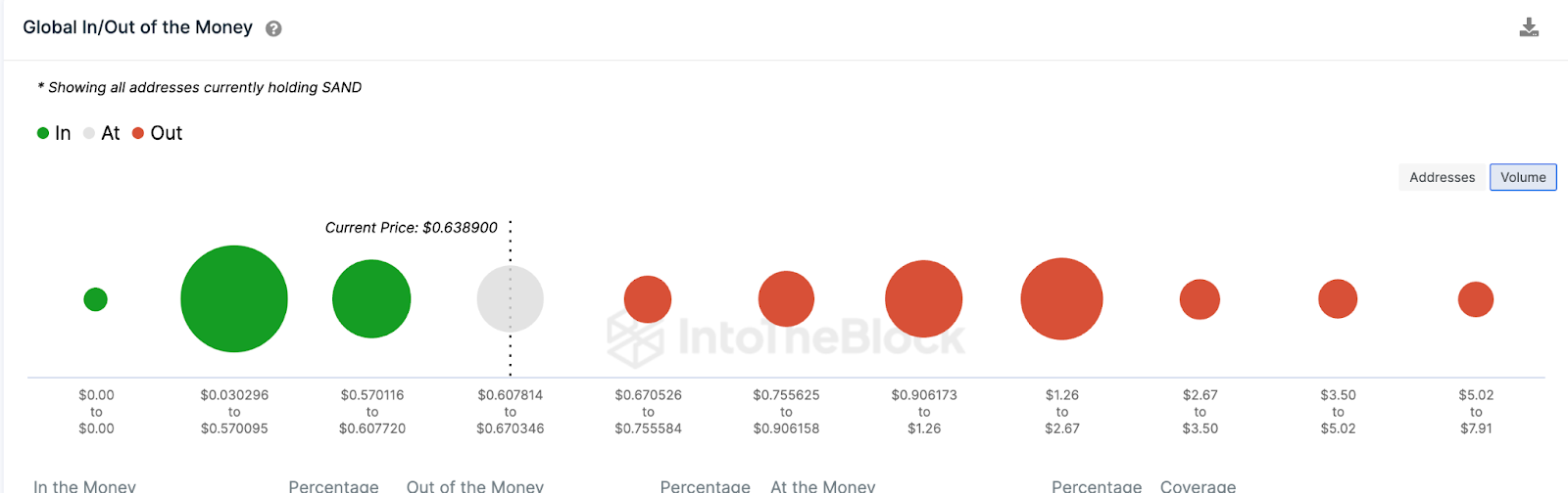 กราฟ Global In/Out of Money ของ IntoTheBlock แสดงให้เห็นว่าราคาช่วงสนับสนุนขนาดใหญ่อาจอยู่ที่ 0.59 ดอลลาร์สหรัฐฯ ในช่วงราคาดังกล่าว มีแอดเดรส 21 รายซึ่งซื้อโทเค็นไป 441,000 รายการอาจมีส่วนทำให้ราคาโทเค็น SAND คงที่