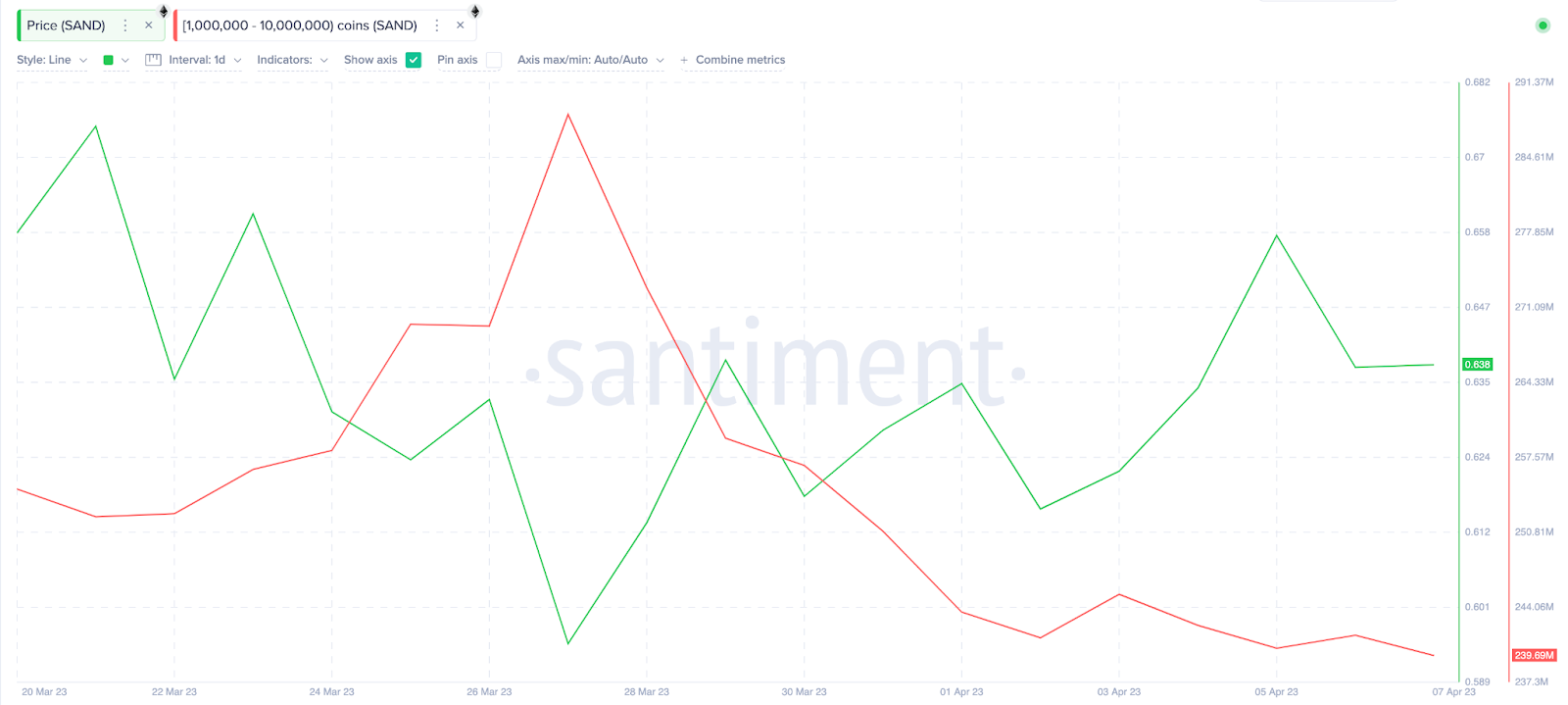 Sponsoredในขณะเดียวกัน การเทขาย SAND ในระดับกลางในบรรดา Crypto Whale ยิ่งตอกย้ำสภาวะขาลง ข้อมูลจาก Santiment พบว่าเหล่า Crypto Whale ถือครองโทเค็น 1 – 10 ล้านเหรียญ และขายโทเค็น SAND ไป คิดเป็นมูลค่า 49 ล้านรายการ กราฟด้านล่างแสดงให้เห็นการเทขายโทเค็นหลังจากราคาลดลงต่ำกว่า 0.60 ดอลลาร์สหรัฐฯ เมื่อวันที่ 27 มีนาคม 2023