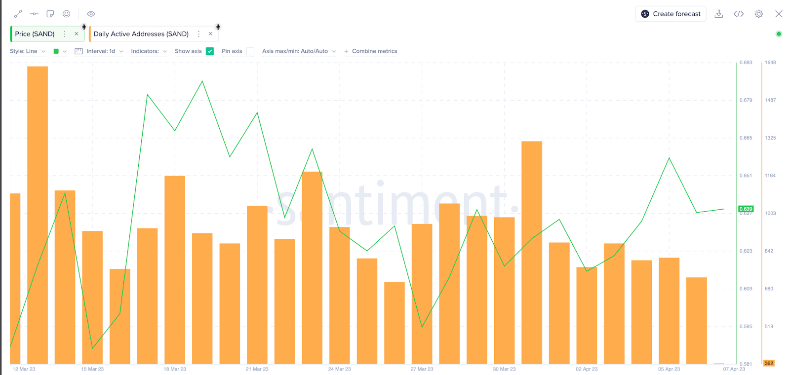 ในช่วงไม่กี่สัปดาห์ที่ผ่านมา การขึ้นราคา SAND ชะลอตัวเนื่องจากโครงการเมตาเวิร์สของแพลตฟอร์มพยายามที่จะรักษาจำนวนผู้ใช้งานให้ได้ 1,000 รายต่อวัน อ้างอิงข้อมูลที่ได้รับจาก Santiment พบว่า Sandbox ไม่สามารถดึงดูดผู้ใช้งานรายวันได้ถึง 1,000 รายตั้งแต่วันที่ 31 มีนาคม 2023
