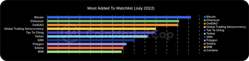 แนวโน้มการเปลี่ยนแปลงที่น่าประหลาดใจที่สุดคือในเดือนกรกฎาคม 2022 รายชื่อโทเค็นที่น่าจับตามองมีแต่สกุลเงินขนาดใหญ่ เช่น Bitcoin และ Ethereum แต่ในเดือนสิงหาคมโทเค็นเหล่านี้ไม่ได้อยู่ในสี่อันดับแรกด้วยซ้ำ