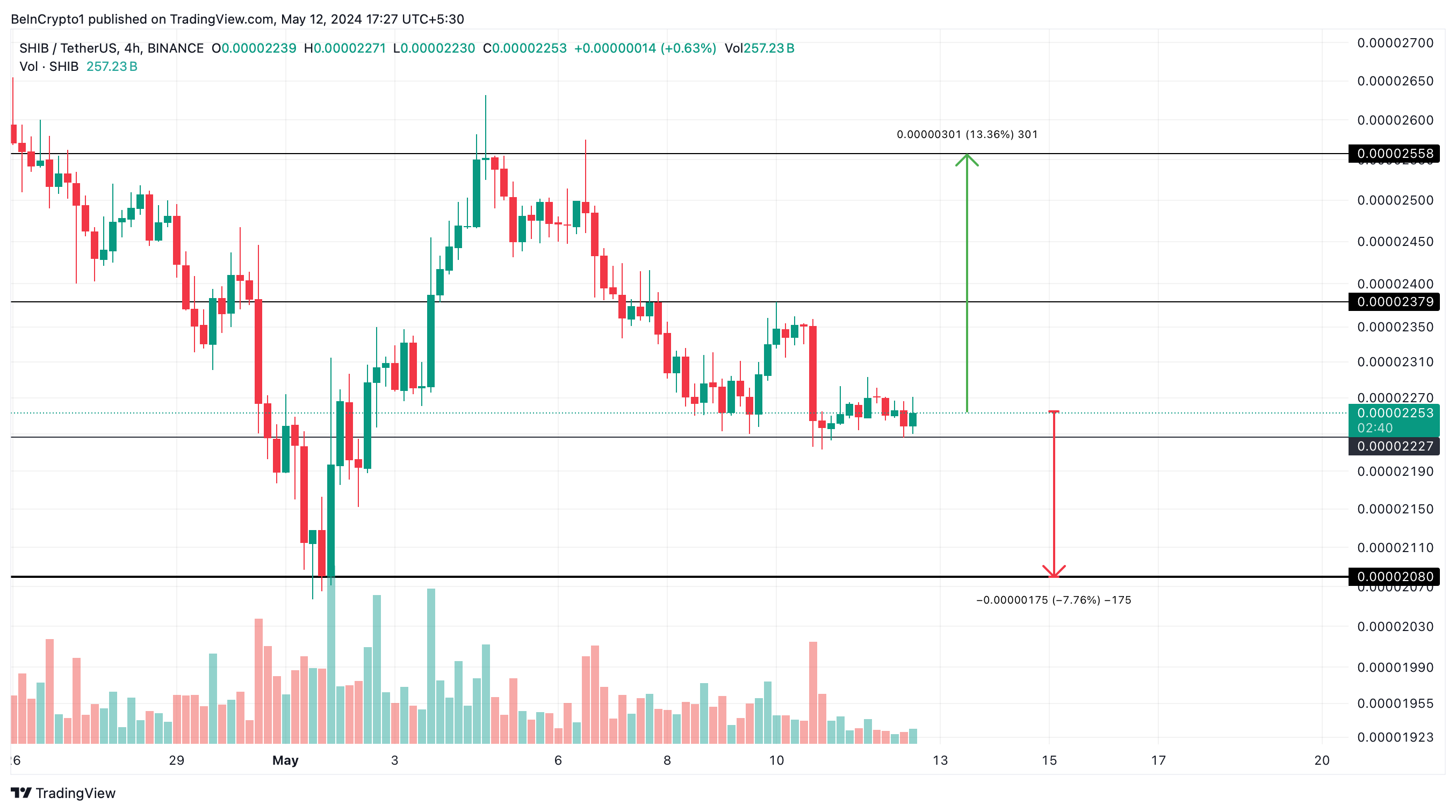 แม้จะมีความก้าวหน้ามากมายเหล่านี้ แต่ราคาของ SHIB ก็ยังคงชะลอตัว ตั้งแต่วันที่ 7 พฤษภาคม มีความผันผวนระหว่าง 0.00002379 ดอลลาร์ ถึง 0.00002227 ดอลลาร์ การ Break Out อาจจะสามารถผลักดันราคาไปที่ 0.00002558 ดอลลาร์ ซึ่งเป็นการเพิ่มขึ้นมากกว่า 13% จากราคาตลาดปัจจุบัน