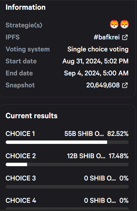 ข้อมูลสแนปชอตแสดงให้เห็นว่าการโหวตได้เริ่มขึ้นแล้ว โดยมีโทเค็น SHIB มากกว่า 55 พันล้านโทเค็น คิดเป็น 82% ของการโหวต ซึ่งสนับสนุนตัวเลือกแรก ตัวเลือกการเผาได้รับคะแนนเสียง 12 พันล้านเสียงหรือ 17% ของทั้งหมด ตัวเลือกที่สามและสี่ยังไม่ได้รับคะแนนเสียงใด ๆ จนถึงขณะนี้