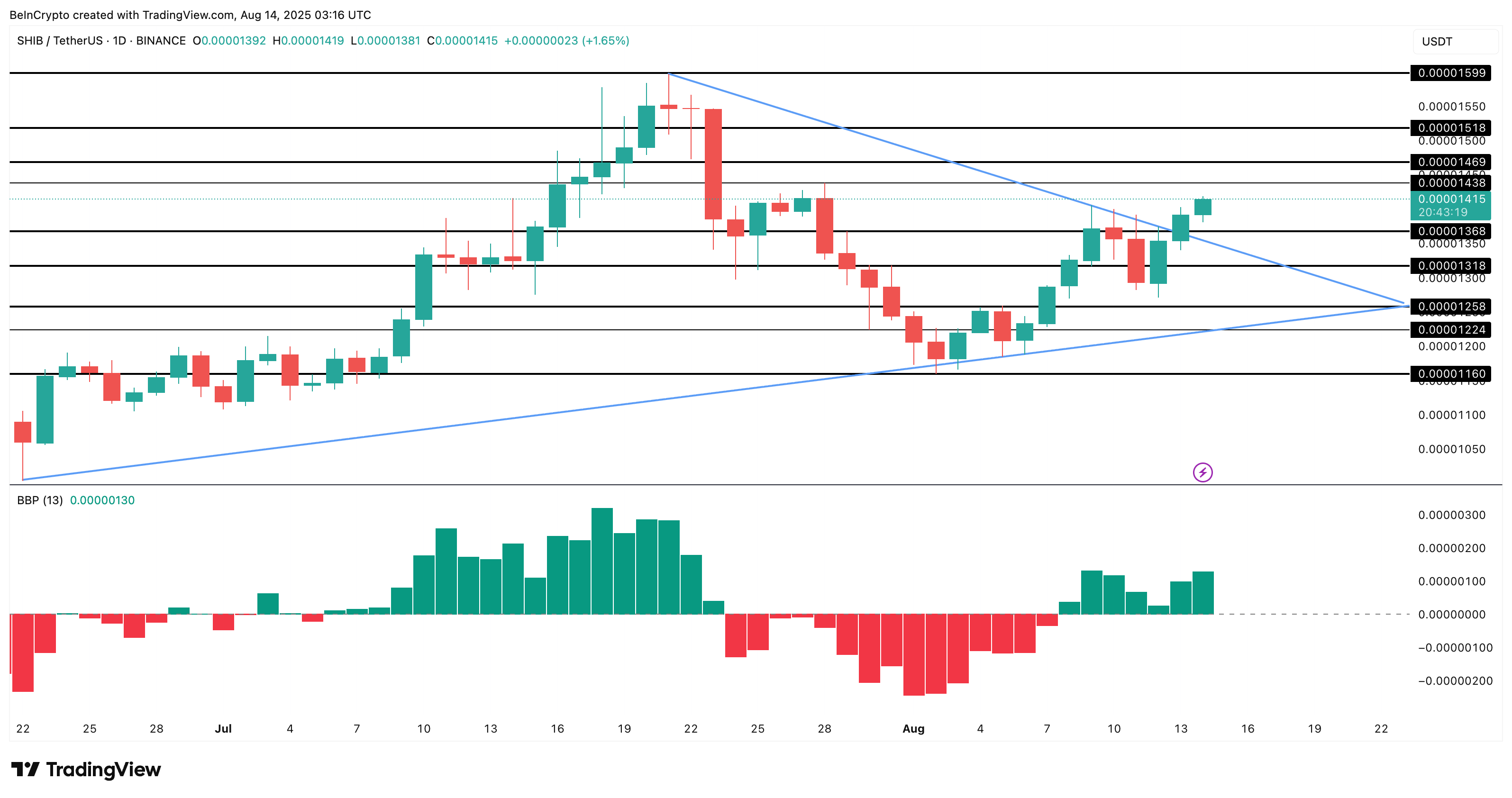ระดับราคาตอนนี้กลายเป็นสนามรบที่แรงตรงข้ามเหล่านี้มาพบกัน ด้วย SHIB ที่ซื้อขายเหนือ $0.00001368 การทะลุยังคงอยู่ สิ่งที่น่าชื่นใจที่สุดเกี่ยวกับการเคลื่อนไหวของราคา SHIB คือการที่มันทะลุออกจากสามเหลี่ยมสมมาตร การดันผ่าน $0.00001438 จะเพิ่มความแข็งแกร่งให้กับการทะลุ